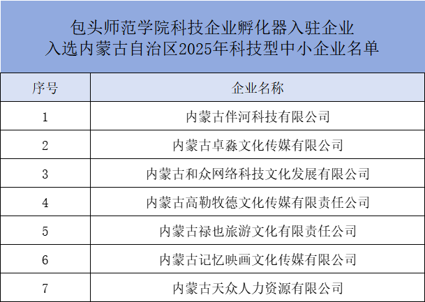近日,内蒙古科学技术厅发布《内蒙古自治区2025年拟入库科技型中小企业名单》,我校科技企业孵化器指导入驻企业积极申报自治区级科技型中小企业,最终内蒙古伴河科技有限公司等7家企业成功入库。