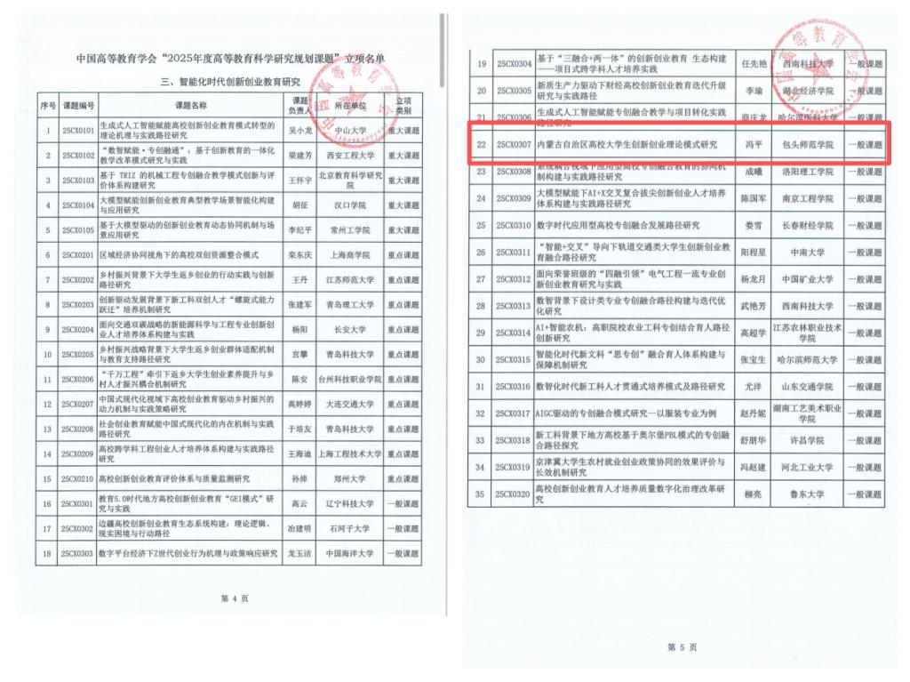 近日,“2025 年度高等教育科学研究规划课题” 立项名单正式公布,我校创新创业教育学院院长冯平研究员主持申报的《内蒙古自治区高校大学生创新创业理论模式研究》成功获批立项。
