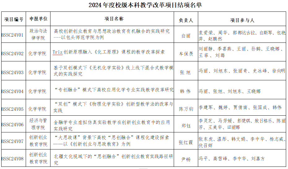 各学院、相关部门: 为进一步推动我校创新创业教育工作的发展,深化创新创业教育教学改革,加强创新创业教育的研究,创新创业教育学院组织开展了2024年度校级本科教学改革项目结项评审工作。现将结项评审结果公布如下: 本次结题范围为2024年度立项的校级本科教学改革项目,共计8项。(名单见附件) 附件:2024年度校级本科教学改革项目结项名单 包头师范学院 2025年12月3日
