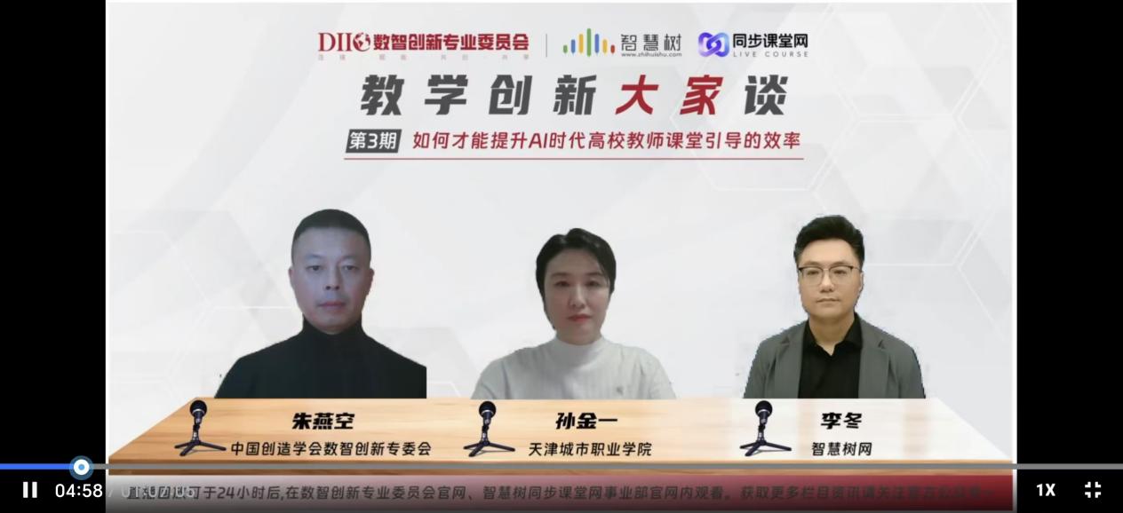 11月12日,我校举行第45期创新创业教研工作坊虚拟教研活动。本次活动以“人工智能时代高校教师课堂引导的效率”为核心主题,特邀天津城市职业学院商贸与创新创业学院院长兼书记孙金一、中国创造学会智慧创新专业委员会副主任委员兼秘书长朱燕空、智慧树网事业部总经理李冬三位嘉宾作分享。我校全体创新创业基础课教师参加了此次活动。